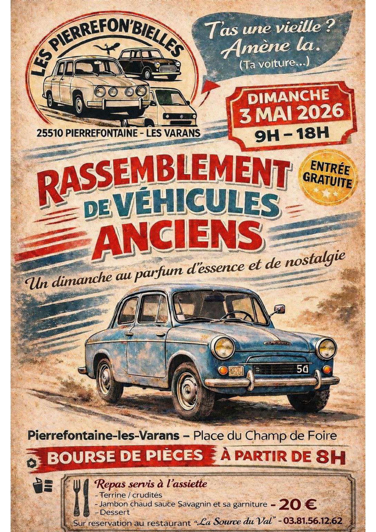 Rassemblement de véhicules anciens (Autos, motos, tracteurs, mobylettes...) le 3 mai 2026 de 9h à 18h place du champ de foire à Pierrefontaine les varans.