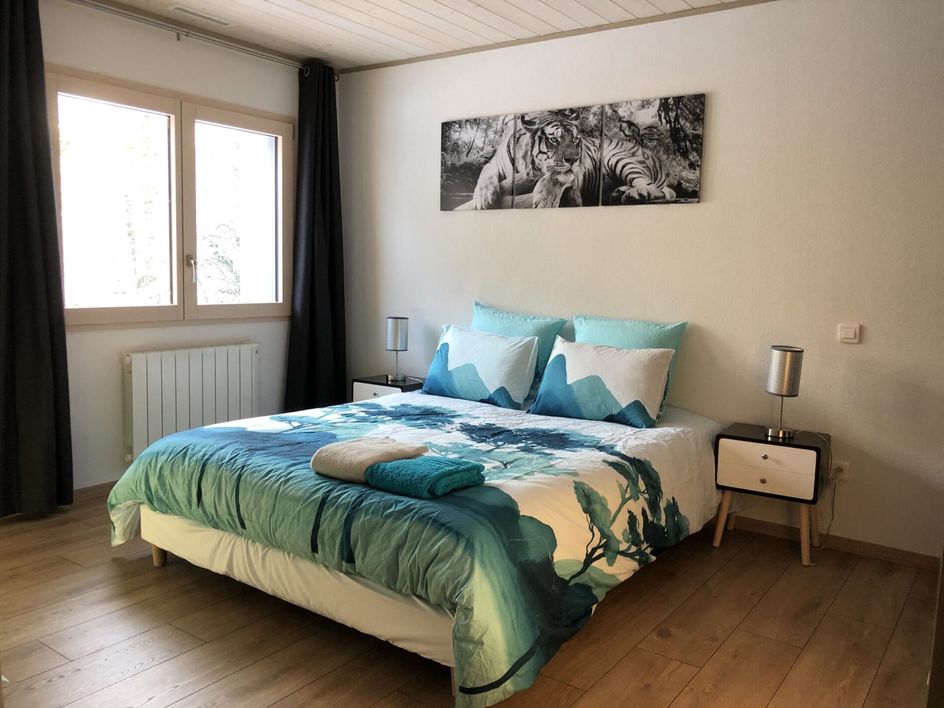 A l’étage, 3 chambres spacieuses et lumineuses ayant chacune une ambiance différente ainsi qu’une grande salle de bain avec douche italienne et toilette. Deux des chambres peuvent accueillir 2 personnes et la dernière 4 personnes.